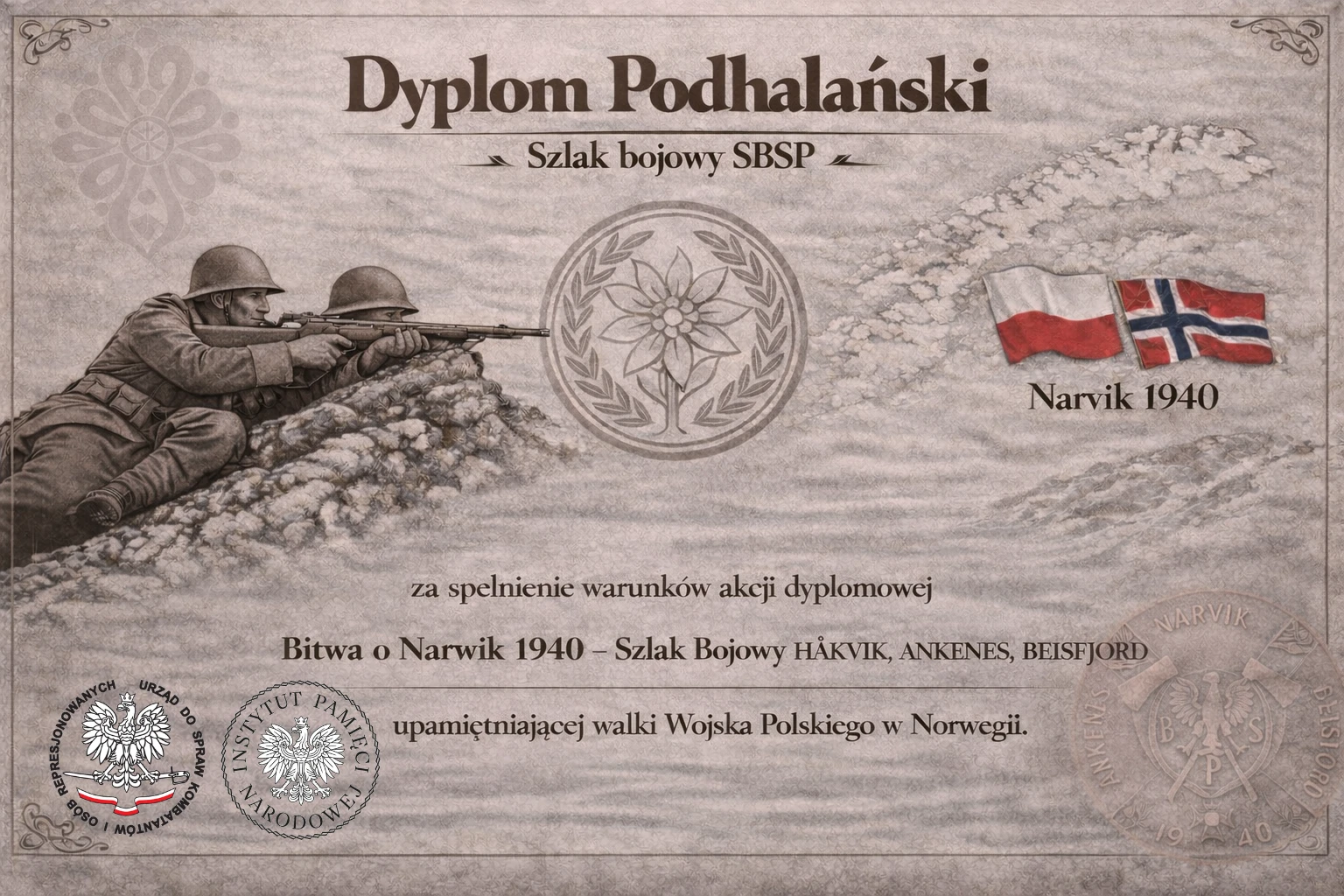 Akcja dyplomowa upamiętnia udział Samodzielnej Brygady Strzelców Podhalańskich oraz Polskiej Marynarki Wojennej w walkach o Narvik w 1940 roku. W kampanii norweskiej polscy żołnierze walczyli w surowych warunkach arktycznych, odnosząc jedno z pierwszych zwycięstw lądowych nad wojskami niemieckimi podczas II wojny światowej. Równocześnie działania alianckie wspierały polskie okręty wojenne operujące w fiordach Norwegii.📅 4 maja 1940 roku w fiordzie Rombakken został zatopiony niszczyciel ORP „Grom”, a wraz z nim poległo 59 polskich marynarzy. Akcja ma na celu przypomnienie lądowego i morskiego wysiłku Polaków oraz popularyzację tej historii w środowisku krótkofalarskim.