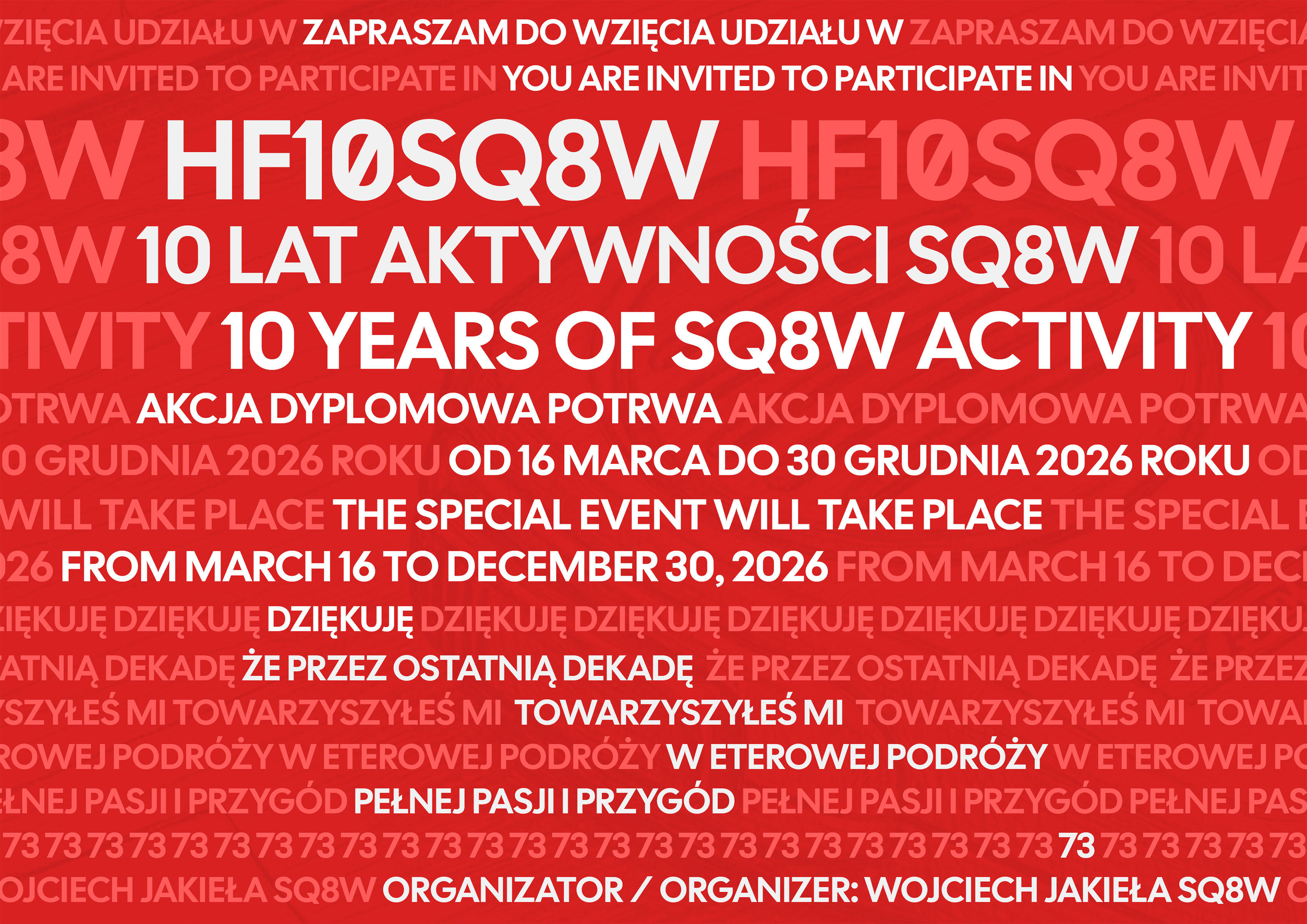 Rok 2026 jest dla mnie wyjątkowy, ponieważ mija 10 lat mojej aktywności krótkofalarskiej. Z tej okazji w eterze pojawi się stacja okolicznościowa HF10SQ8W, pracująca w dniach 16 marca - 30 grudnia 2026.